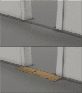 In diesem Fall sollte die Rampenbreite dem Abstand zwischen den beiden Außenseite des Türrahmens entsprechen, sodass sich ein homogenes Gesamtbild ergibt. Da für den Einbau neuer Türen bei Höhenunterschieden zwischen den Räumen üblicherweise das obere Bodenniveau zugrunde gelegt wird, entsteht hier ein Freiraum unter dem Überstand des Türrahmens in Richtung des niedriger gelegenen Raumes. In diesem Fall empfehlen wir die Konfiguration eines Podestes, welches sich an den schrägen Teil der Rampe anschließt und den Überhang der Türzarge unterfüttert.