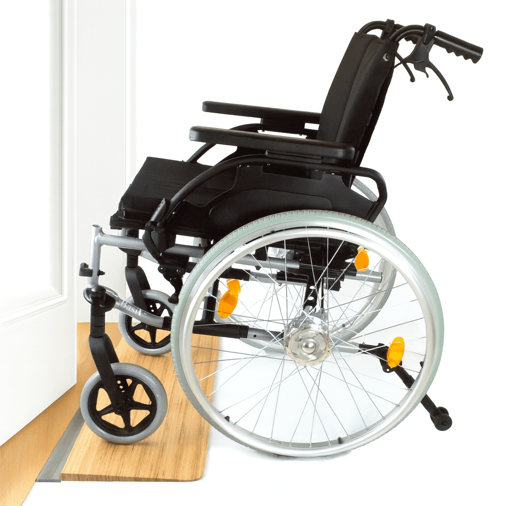 Geeignet zum sicheren Überwinden von Türschwellen für Rollstuhl & Rollator. Gefertigt aus Massivholz in Eiche, Buche, Fichte oder Baubuche – für den Innenbereich.